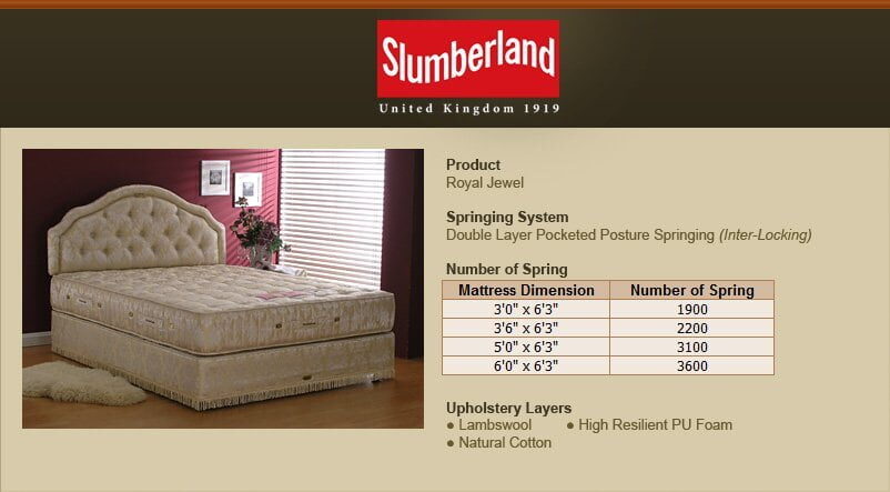 Using the advanced Posture Springing® and state-of-the-art Pocketed Posture Springing System®, Slumberland beds today are widely recognised as the world leader in their own field with unmatched sleeping comfort, support and durability.We, at Slumberland, firmly believe that the hallmark of success is how well we meet the needs of our customer, We are therefore dedicated to understand our customers’ requirements and utilising our manufacturing and research experience creatively to satisfy those needs.Combining the latest technology, traditional bed making craftsmanship and excellent customer service keeps Slumberland at the forefront of bed manufacturing well into the future.